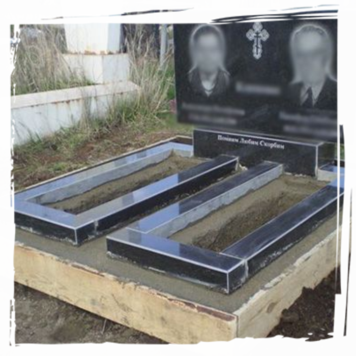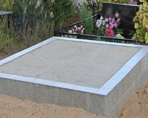 Второй вариант — фундамент укладывается только по периметру под памятником и цветником, выступая на 20-30 см за их габариты. При таком способе вес надгробия равномерно распределяется по всему основанию, что препятствует проседанию или перекосу сооружения. Примогильная же территория остается нетронутой.